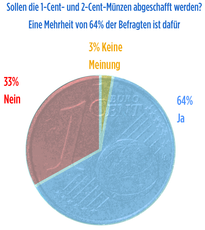 Ein anderes Thema, das in der Umfrage angeschnitten wurde, ist die Frage, ob die 1-Cent- und 2-Cent-Münzen abgeschafft werden sollten oder nicht. Rund zwei Drittel der Befragten (64 Prozent) können auf die kleinsten Münzen verzichten, 33 Prozent wollen sie weiter behalten und drei Prozent haben keine Meinung dazu. Lediglich in Portugal und Lettland spricht sich mit 49 Prozent eine relative Mehrheit für den Erhalt der 1-Cent- und 2-Cent-Münzen aus, in allen anderen Euro-Ländern überwiegt eine absolute Mehrheit für die Abschaffung dieser Münzen. Vor allem die Finnen wollen die kleinen Münzen los werden (86 Prozent Zustimmung), während in Luxemburg nur 65 Prozent der Befragten dieser Ansicht sind und 34 Prozent diese Münzen weiter verwenden wollen.