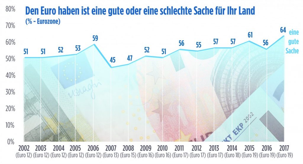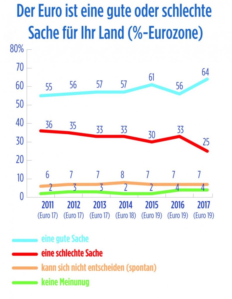 Wie aus der mittlerweile 16. Umfrage zur gemeinsamen Währung – seit diese im Jahr 2002 eingeführt wurde – hervorgeht, finden mittlerweile 64 Prozent der Befragten in der Eurozone, dass die Währung „eine gute Sache“ für ihr Land ist. Bei der letzten Umfrage im vergangenen Jahr waren nur 56 Prozent dieser Meinung. 25 Prozent meinten, der Euro sei eine schlechte Sache für ihr Land, sieben Prozent konnten sich nicht entscheiden und vier Prozent wussten keine Antwort zu geben.