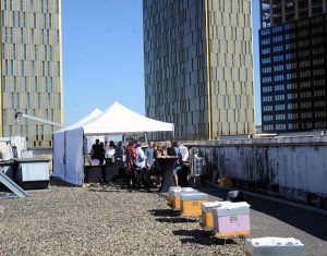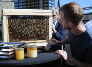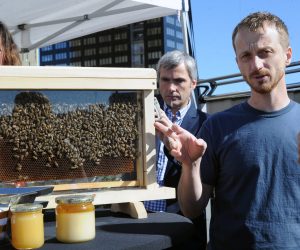 Die Idee des „Honigs aus dem Viertel“ war geboren. Davon leben konnte der Hobby-Imker bisher nicht. „Um die Imkerei gewinnbringend zu betreiben, sind rund 400 Bienenkästen nötig. Davon bin ich weit entfernt“, sagt der junge Mann. Seine Leidenschaft treibe ihn dennoch an, sein Hobby zum Beruf zu machen. Seit dem Frühjahr 2017 sind die fünf Bienenstöcke nun auf dem Hoteldach aufgestellt, einem von zwei Standorten auf Kirchberg. Und seitdem wird hoch über den Dächern der Hauptstadt feinster Rapshonig geerntet.