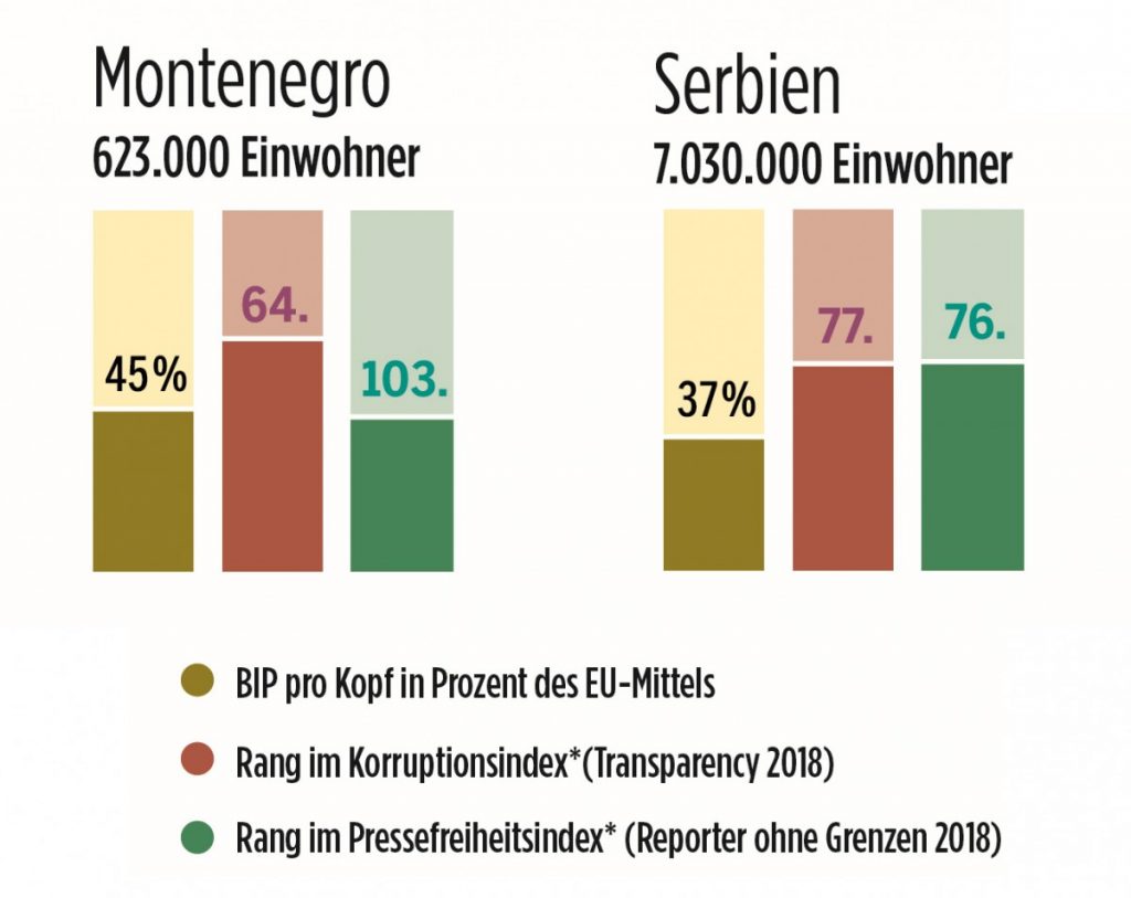 Formal am weitesten ist das seit 2006 unabhängige Montenegro. Bei den 2012 aufgenommenen Beitrittsverhandlungen hat Podgorica 30 von 33 Kapiteln eröffnet und drei abgeschlossen. Zwar ist der Euro seit 2002 in Montenegro genauso wie im Kosovo offizielles Zahlungsmittel. Doch der von Mafia-Abrechnungen erschütterte Küstenstaat scheint v.a. in Sachen des laxen Kampfs gegen die organisierte Kriminalität sowie der Sicherung rechtsstaatlicher Verhältnisse und Pressefreiheit nicht beitrittsreif.
