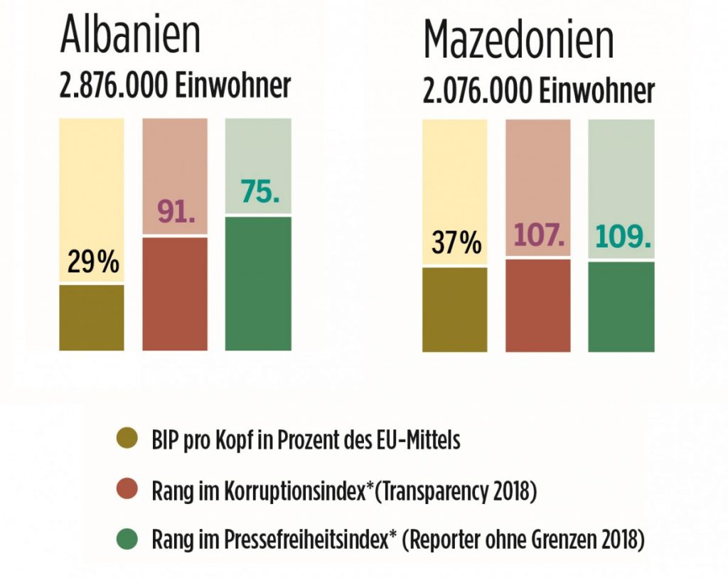 Selbst bei baldigem Verhandlungsbeginn wäre vor 2030 kaum mit einem Beitritt der beiden Nachbarn zu rechnen: Zu groß scheinen noch deren Defizite. Albanien ist seit 2009 Mitglied der NATO und erhielt 2014 den Status eines Beitrittskandidaten. Zwar weist das Land seit Jahren ein solides Wachstum auf. Doch nicht nur der große Entwicklungsrückstand sorgt für Skepsis. Auch der korrupte Justizapparat und die geschäftstüchtige Politikerkaste haben dem „Kolumbien Europas“ den fragwürdigen Aufstieg zu Europas größten Cannabis-Produzenten beschert.