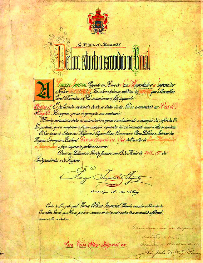 La „Lei Aurea“, signée le 13 mai 1888, était composée d’uniquement deux articles: le premier prévoyant la libération des esclaves en territoire brésilien et le second l’abrogation de toute loi qui serait contraire à cette mesure.