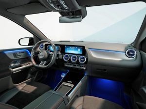 In den Innenraum zieht in beiden Kompaktbaureihen serienmäßig das frei stehende Doppel-Screen-Display mit einem Sieben-Zoll- und dem größeren 10,25-Zoll-MBUX-Display im Mittelpunkt ein. Optional sind zwei 10,25-Zoll-Displays mit Wide-Screen-Optik erhältlich. Die Rückfahrkamera ist Standard. Das mit Nappaleder bezogene Lenkrad präsentiert sich ebenfalls neu und es wurden mehr recycelte Materialien im Interieur verwendet, etwa bei den Sitzen. Das Telematiksystem wurde überarbeitet.