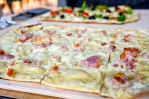 „Wir wollten unseren Kunden eine familiäre Atmosphäre bieten.“ Der ungezwungene Umgang „ohne Chi-Chi, aber dennoch mit hochwertigem Service“ gehört hier dazu. Bodenständig, mit ausgesuchten Zutaten sind auch die „Hamen-“ und „Kéisschmier“-Klassiker für den kleinen Hunger, verschiedene Variationen „Flammkuchen“, Caesar-Salat, eine Tagessuppe, Bulgur-Salat mit Gemüse oder eine „Feierstengszalot“. Unter den Hauptgerichten gibt es neben allerlei Burgern (Asia oder Angus) auch Risotto, Kalbs-Cordon-bleu, „Ham, Fritten an Zalot“, „Kniddele mat Speckzooss“ oder eine „Paschtéit“ mit Pommes und Salat. Letztere ist das meistverkaufte Gericht seit der Eröffnung, bestätigt Nicolas. Und auch an diesem Tag überholen die „Paschtéit“-Bestellungen zahlenmäßig das Tagesgericht. Der hohe Qualitätsanspruch der Küche gilt auch für die Getränke. Ob Cocktails oder Weine, „wir arbeiten mit 15 Mosel-Winzern zusammen“.