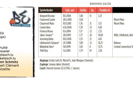 Ein talentiertes Team, mit vielen Jugendspielerinnen, die in den vergangenen Jahren mehrmals mit den Espoirs triumphieren konnten, doch irgendwie wollte der Knoten beim Basket Esch auch in der letzten Saison nicht so wirklich platzen. Einmal mehr spielte das Team aus der Minette-Metropole in der zweiten Saisonphase in der Abstiegsgruppe. Eine Tatsache, die auch die erfahrene Kapitänin Tatsiana Likhtarovich rätseln lässt. „Wir haben viele gute Jugendspielerinnen, die beim Klub geblieben sind und sich weiterentwickelt haben. Auch die nächste Generation kommt langsam hoch. Eigentlich sind wir gut aufgestellt.“ Für die 37-Jährige lagen die Probleme in den letzten Jahren so vor allem auf der zweiten Profiposition, wo Verletzungen und andere Probleme fast schon an der Tagesordnung waren. „Das fehlende Puzzlestück lag eindeutig dort.“