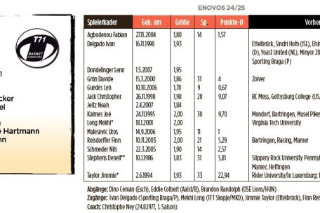 Nach einem gelungenen Transfersommer geht der T71 mit dem wohl stärksten Kader der Enovos League in die neue Saison. Vieles hängt jedoch von der Fitness von Schlüsselspieler Delgado ab. Bleibt er verletzungsfrei, kann der Weg zum Titel nur über Düdelingen führen. (O.J.)