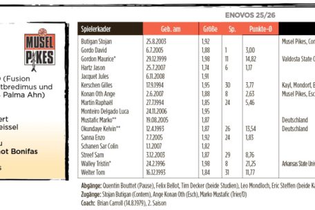 Die Pikes, bei der starken Konkurrenz nicht im Abstiegskampf zu sehen, wäre sicherlich mutig. Werden die Karten mit einer eingespielten Starting Five und dem einen oder anderen frechen Newcomer richtig ausgespielt, könnten die Moselaner durchaus alle überraschen und einem Stammgast der Play-offs die Abstiegsrunde bescheren.