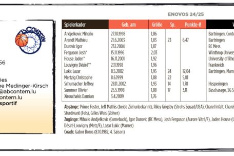 Mit Josh Ferguson und Jayden House hat sich der AB Contern zwei interessante Neuzugänge gesichert. Ferguson ist ein „technisch und taktisch grundsolider Spieler“ und House gilt als „außergewöhnliches Talent“, das sich allerdings erst an das europäische Spielniveau gewöhnen muss. Igor Durovic kommt derweil aus der zweiten Liga, während Désiré Louvigny als Non-Pro-Spieler gilt. Große Hoffnungen setzt Boros zudem in Lazar Lukic, der vom Ligakonkurrenten Mamer zum Team hinzustößt. „Er bringt eine physische Komponente mit, die wir so letztes Jahr nicht hatten.“ Auch der ehemalige Nationalspieler Mihailo Andjelkovic kehrt nach einem kurzen Intermezzo in Düdelingen und einer persönlichen Auszeit nach Contern zurück. Er soll wieder eine zentrale Rolle im Spiel des ABC übernehmen.