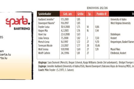 In der Zwischensaison gab es keine allzu großen Umwälzungen im Bartringer Kader. Die beiden US-Amerikanerinnen wurden ausgetauscht. „Wir waren von Schenck und Williams besonders in den Finalspielen enttäuscht. Dieses Jahr haben wir mehr Größe auf dem Platz und können mit den beiden Profispielerinnen sehr variabel agieren. Unser Spiel wird sicherlich etwas anders, vielleicht weniger schnell und mehr unter die Körbe verlagert“, so die Ansage von Coach Mike Feyder. Mit Jennifer Aadland und Naomi Davenport hat Bartringen zwei treffsichere Spielerinnen auf den Profipositionen angeheuert und besitzt somit mehrere Optionen innen (zusammen mit Cathrin Wolff) und außen (mit Nicole Torresani). Mit Tereza Liska (Hostert) und Joy Havé (Düdelingen) vervollständigen zwei junge Spielerinnen den Kader der ambitionierten Spartanerinnen. Bridget Yoerger hat diesmal ihre Karriere endgültig beendet. Bleibt abzuwarten, wie Bartringen diesen Weggang kompensieren kann.