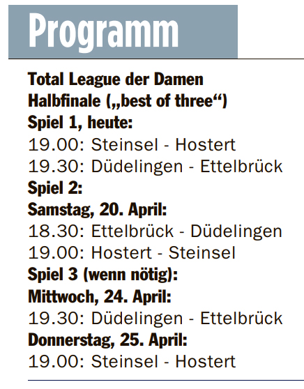 Bereits vor Wochen hatten der Tabellenerste Düdelingen und der amtierende Pokalsieger Steinsel ihr Ticket für das Final Four gebucht. Die anderen beiden Halbfinalisten mussten da schon länger bangen. Hostert machte seine Teilnahme am vorletzten, Ettelbrück sogar erst am letzten Spieltag der Titelgruppe perfekt. Somit trifft der T71 heute Abend auf die Etzella, Steinsel empfängt im Remake des Pokalfinales den Gréngewald.