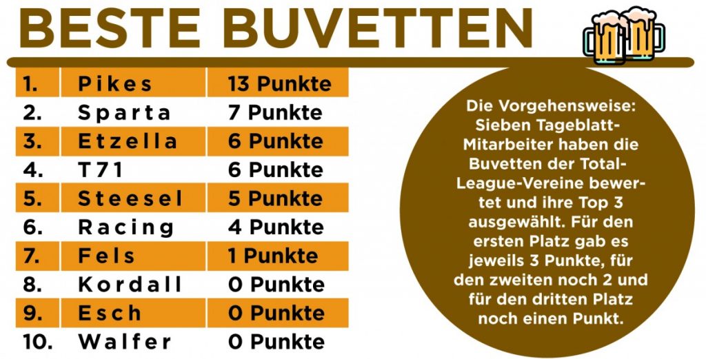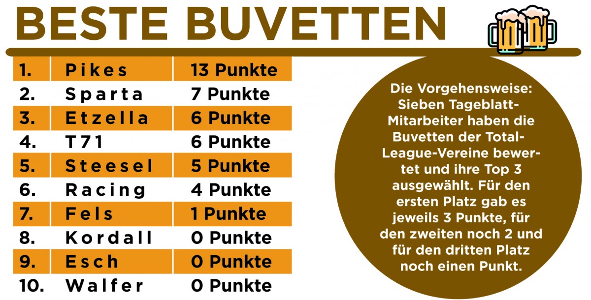 Rang zwei geht an die Sparta Bartringen: Drängen an der Theke, das kommt im Centre Atert eher selten vor, denn hier findet man den längsten Tresen der Total League. Dies überzeugte auch die Korrespondenten. Genauso wie die abwechselnden Ideen: mal ein Gin- oder Waffel-Stand, das kam an.