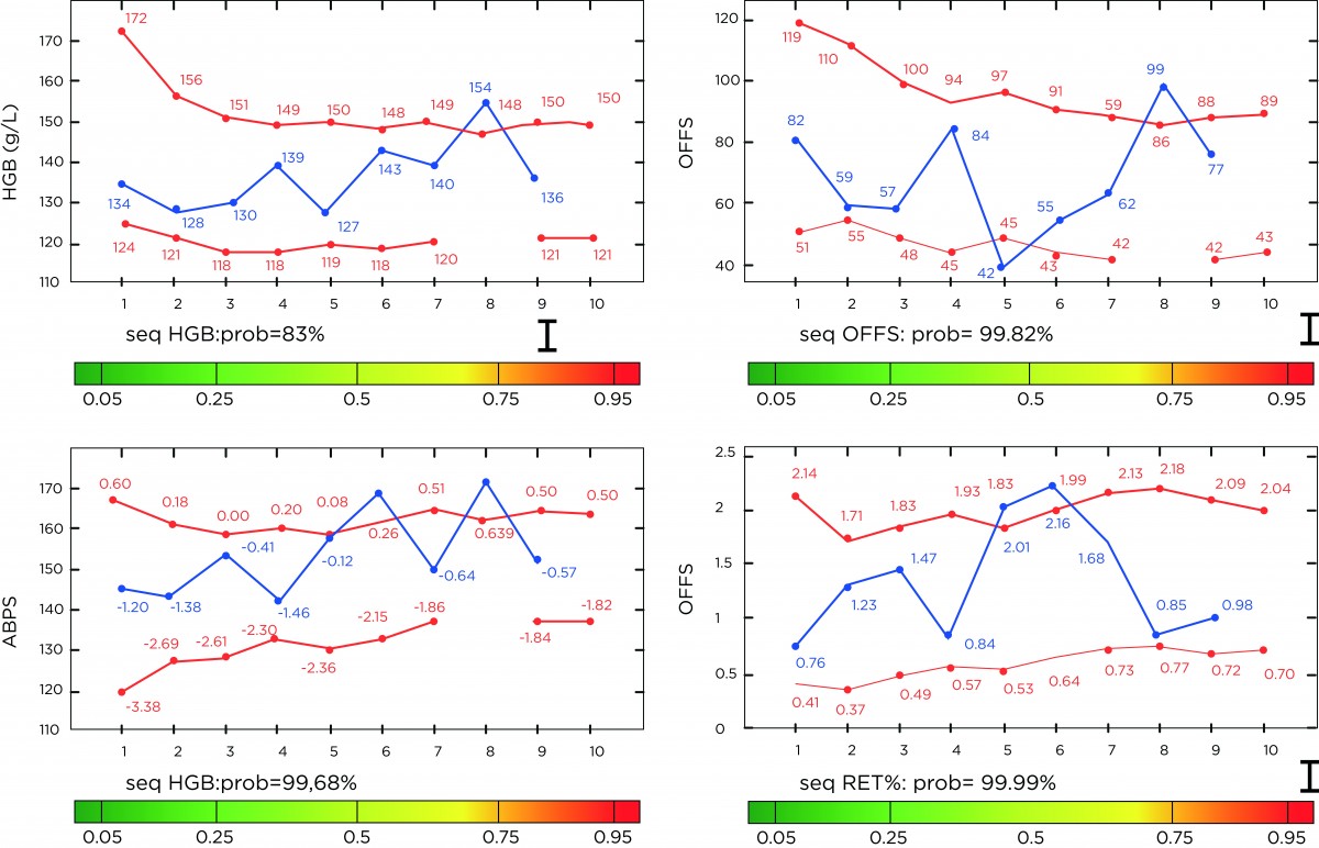 Beispiel eines biologischen Passes: in Rot die individuell errechneten Grenzwerte der verschiedenen Blutparameter, in Blau die Werte des Athleten nach verschiedenen Blutproben. Überschreitet die blaue Linie die Grenzwerte, ist das ein Indiz für Doping.