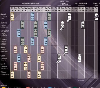 Die Gruppensieger und -zweiten der vier Vierergruppen ziehen in die K.-o.-Runde ein. Die Viertelfinals stehen vom 16. bis 19. Juli an. Die Vorschlussrunde steigt am 22./23. Juli in Genf und Zürich, das Endspiel am 27. Juli um 18.00 Uhr im St. Jakob-Park.