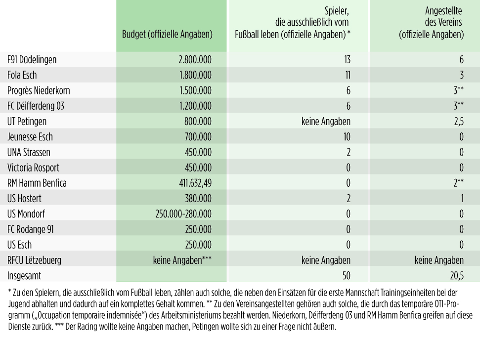 Vor allem der Progrès hat in den letzten vier Jahren seinen Etat fast verdoppelt. Rekordmeister Jeunesse befindet sich nicht mehr unter den Top fünf, bekommt dafür aber personelle Unterstützung vom F91 Düdelingen, die sich nicht in der Bilanz niederschlägt. Mit dem kleinsten Budget müssen Rodange und die US Esch auskommen (beide rund 250.000 Euro).