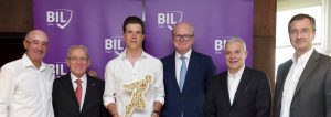 Drei Tage vor dem Auftakt der nationalen Straßenmeisterschaften in Differdingen und Zolver wurde Radprofi Bob Jungels gestern im Hauptsitz der BIL noch einmal für seine Wahl zum Sportler des Jahres 2018 geehrt. Zum Foto: Camille Dahm (Präsident der FSCL), Petz Lahure (Präsident von sportpress.lu), Bob Jungels, BIL-Generaldirektor Marcel Leyers, Sportminister Dan Kersch und COSL-Präsident André…