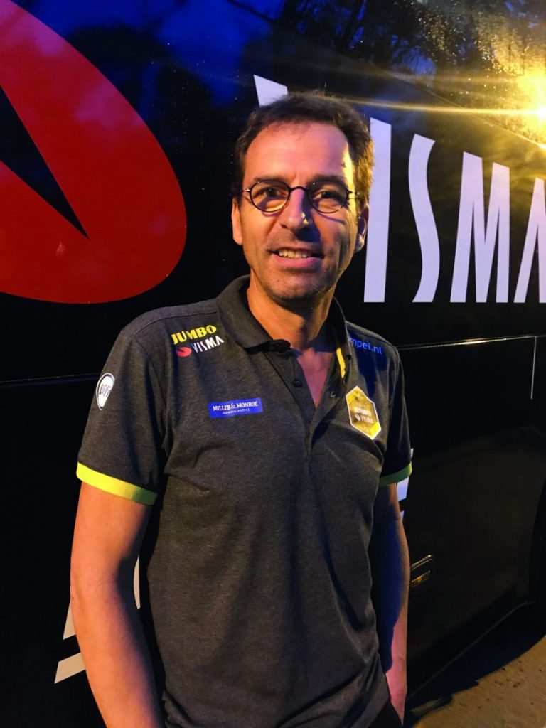 Und wie der Zufall es so wollte, ist seine Frau Köchin von Beruf. Nur kurze Zeit später wurde ihr die positive Nachricht mitgeteilt, dass sie in diesem Jahr bei einigen Rundfahrten dabei sein würde. Spanien, Italien und Frankreich standen u.a. auf dem Programm. „Da wurde ich schon ein wenig neidisch“, sagt er. Aus diesem Grund habe er aus Spaß nachgefragt, ob nicht noch eine Stelle für ihn frei wäre, vielleicht sogar als Busfahrer. In der Vergangenheit habe er nämlich so manche Erfahrungen in diesem Bereich sammeln können. Und wie es Fortuna so wollte, war zu dieser Zeit dieser Posten dünn – oder anders gesagt gar nicht – besetzt. Einer der routiniertesten Fahrer im Team, der u.a. schon 25 Mal bei der Tour de France am Lenkrad saß, musste aufgrund einer Verletzung im Nackenbereich für den diesjährigen Giro passen. Nach kurzer Abklärung mit seiner Dienststelle nahm sich Van Hulten der Herausforderung an. „Aus einer Schnapsidee wurde so schließlich absoluter Ernst“, sagt er.