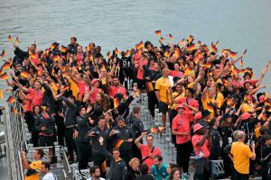Um kurz nach 19.30 Uhr, als der Himmel gerade die Schleusen öffnete, war auch die luxemburger Mannschaft „in See“ gestochen. Erwartungsgemäß am lautesten wurden die französische Mannschaft gefeiert, die den Abschluss der Parade bildete.