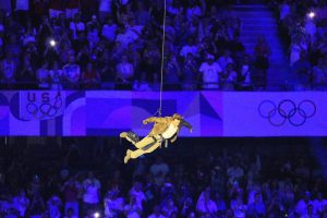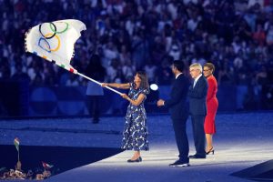 Im Rahmen der Feier wurde auch die olympische Fahne von der Pariser Bürgermeisterin Anne Hidalgo an ihre Kollegin Karen Bass aus Los Angeles übergeben. „Wir werden einen historischen Moment teilen und eine Botschaft an die Mädchen in der ganzen Welt senden, dass sie alles schaffen können“, sagte Bass zuvor über die erstmalige Übergabe der Flagge von Frau zu Frau.