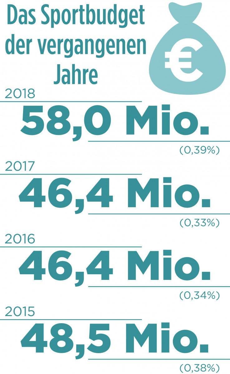 Ohne Geld geht nichts, auch im Sport. Das Budget des Sportministeriums zählt traditionell zu den kleinsten im Staatshaushalt. Dieses Jahr liegen die Ausgaben bei knapp 58 Millionen Euro, was 0,39 Prozent der Gesamtausgaben entspricht.