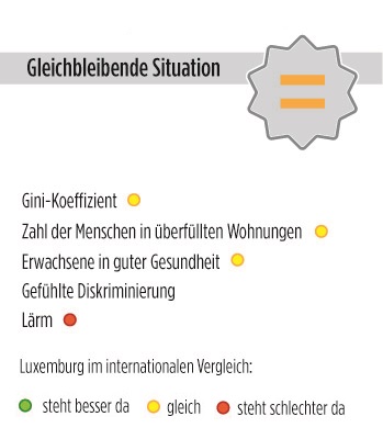 Zwar finden viele Menschen in Luxemburg, dass sie Berufs- und Privatleben besser vereinbaren können als noch vor ein paar Jahren, allerdings steht das Großherzogtum im Vergleich mit anderen westeuropäischen Staaten in diesem Bereich eher schlecht da und kann hier noch deutlich aufholen. Im Bereich Staatswesen und Bürger und im Umweltschutz zeigt sich eher ein gemischtes Bild.