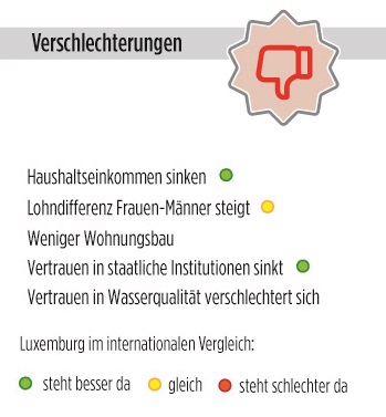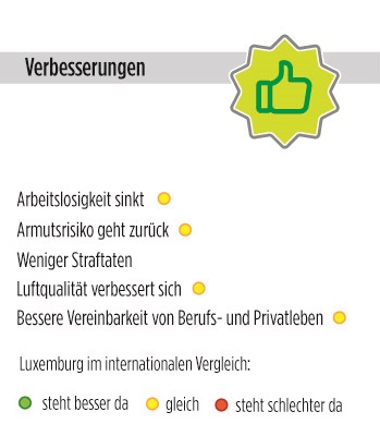 Zwar finden viele Menschen in Luxemburg, dass sie Berufs- und Privatleben besser vereinbaren können als noch vor ein paar Jahren, allerdings steht das Großherzogtum im Vergleich mit anderen westeuropäischen Staaten in diesem Bereich eher schlecht da und kann hier noch deutlich aufholen. Im Bereich Staatswesen und Bürger und im Umweltschutz zeigt sich eher ein gemischtes Bild.